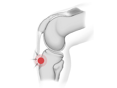 Воспаление точки крепления сухожилия надколенника к большеберцовой кости. В основном это встречается у мальчиков в возрасте от 10 до 16 лет, но также наблюдается среди девочек, которые много тренируются. Причиной возникновения болезни является не только последствие ушиба, падения или физической нагрузки, но и без какого-либо внешнего воздействия начинаются боли при сильном разгибании или крайнем сгибании колена, развивается ограниченная, плотная, резко болезненная при надавливании припухлость большеберцового бугра. Факторы риска развития болезни Осгуда — Шлаттера: баскетбол, хоккей, футбол, акробатика, волейбол, лыжные гонки, лёгкая атлетика, тяжёлая атлетика, ирландские танцы, балет, кикбоксинг, горные лыжи, спортивный туризм, большой теннис, дзюдо, самбо, гимнастика, кёрлинг, бальные танцы, велоспорт, гандбол. Проблема возникает спонтанно, без видимых на то причин. Болезнь хорошо поддается лечению, но для полного излечения может потребоваться несколько лет.