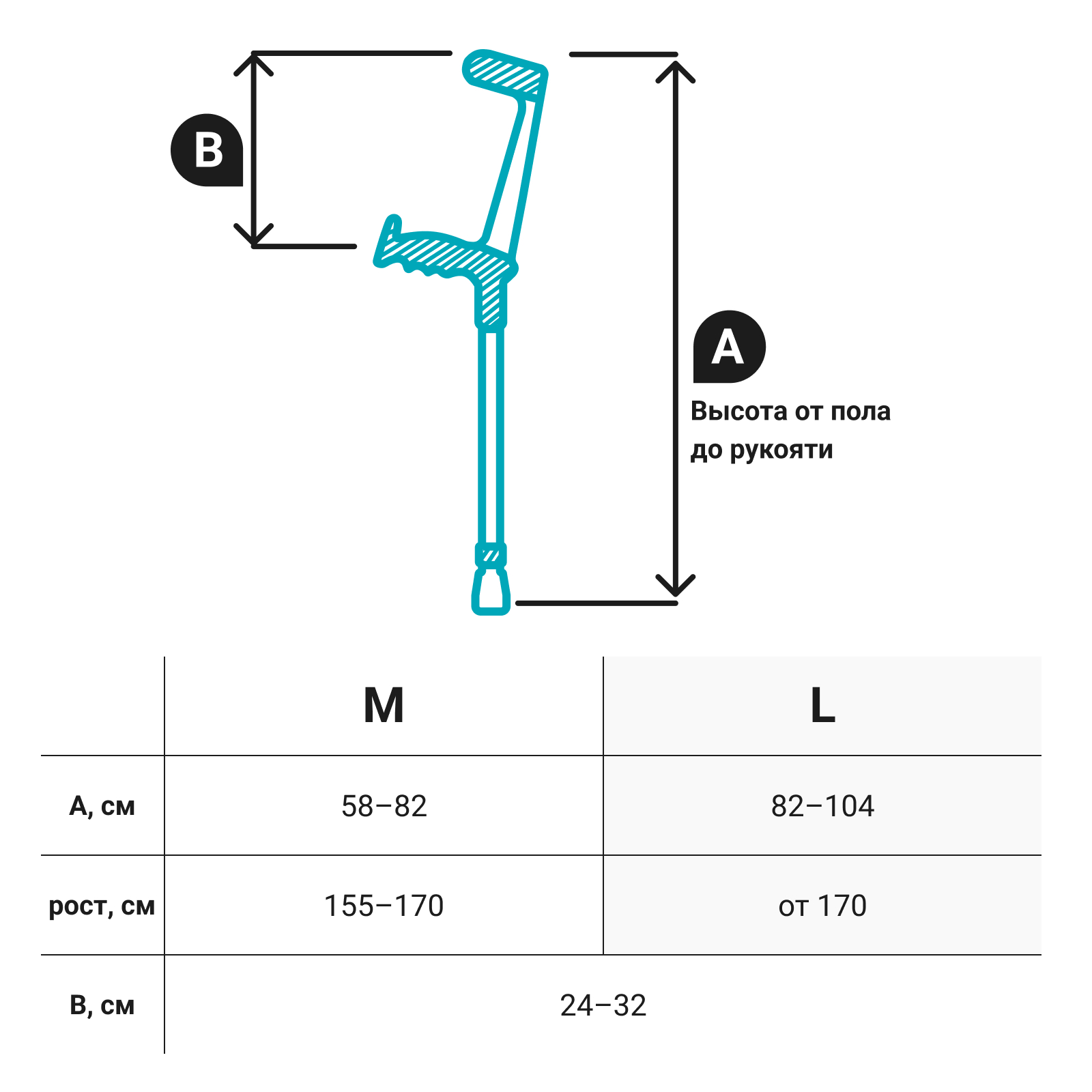 Высота от пола до рукояти 58-82 см (размер М) и 82-104 см (размер L).