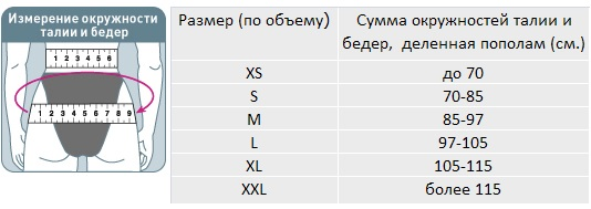 Для правильного выбора подходящего размера ортопедического корсета Orlett IBS-3006 необходимо сантиметровой лентой измерить окружность талии и бедер. Далее сумму окружностей поделить пополам и воспользоваться таблицей, представленной ниже: