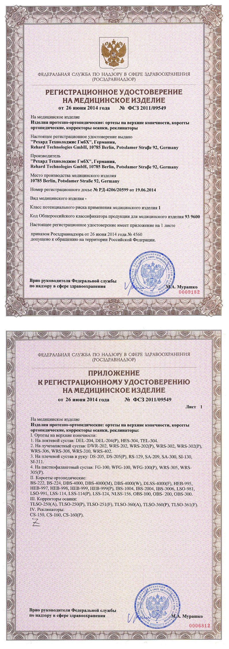 Декларация соответствия и Регистрационное удостоверение.