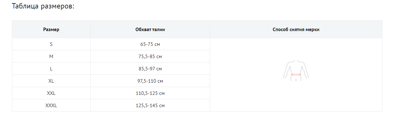| Размер | Обхват талии | Способ снятия мерки |