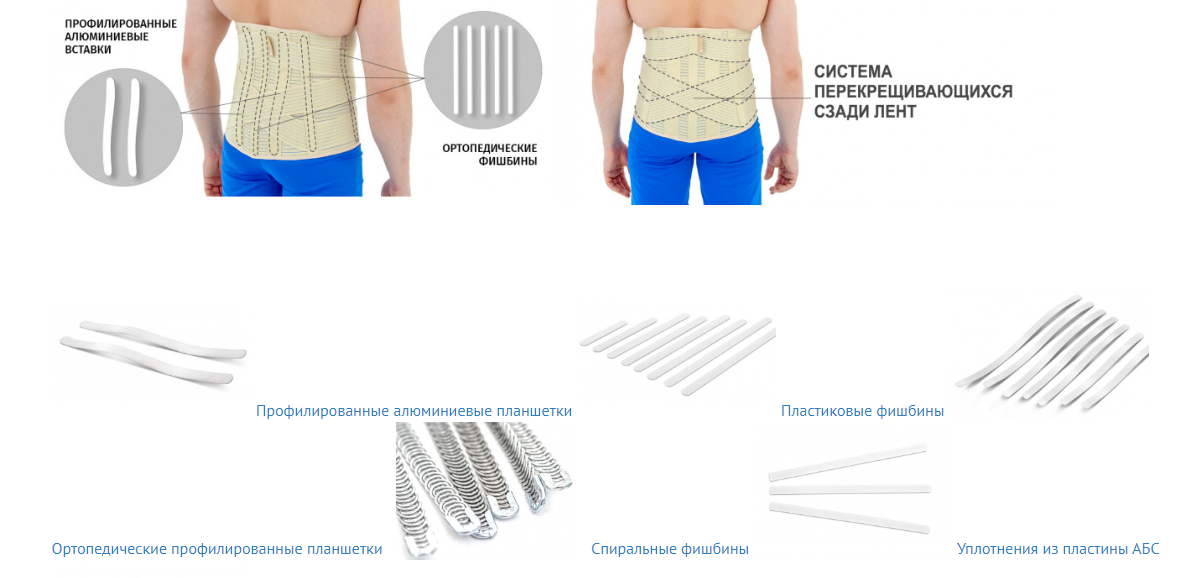 В дополнении к шинам и ребрам корсет имеет специальные перекрещивающиеся сзади ленты. Ленты плотно прижимают шины к поясничному лордозу, усиливая разгрузочный эффект Шины поддерживают позвонки и мягкие ткани, такие как связки и мышцы