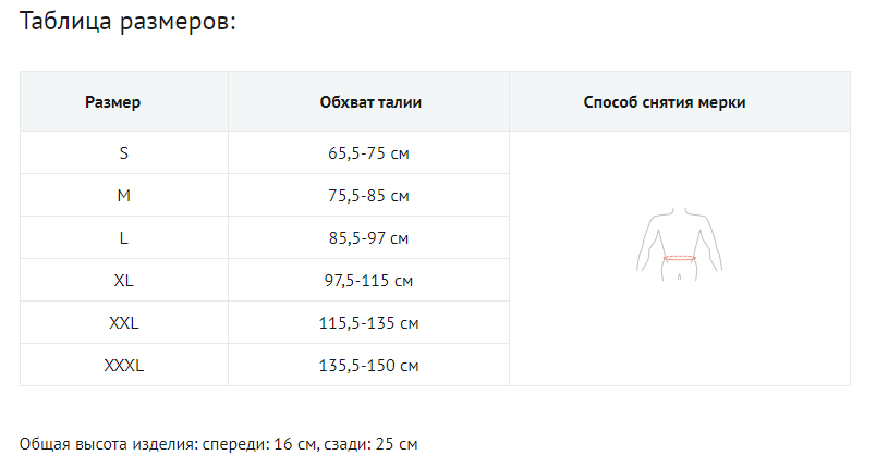- При выборе следует ориентироваться на обхват талии – поставляется в шести размерах с обхватом от 65,5 до 150 см включительно