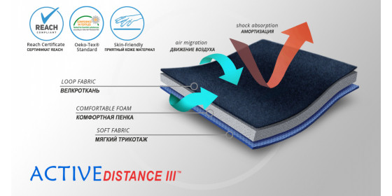 ActiveDistance III - активный трехслойный материал, состоящий из очень прочной нерастягивающейся обложки из полиамидной велкроткани, комфортной пенки и хлопчатой махровой подкладки, которая поддерживает нужный микроклимат около кожи и эффективно отводит пот. Подкладка приятная для кожи. Поверхность для липучек велкроткани существенно облегчает использование ортезов изготовленных из этого материала.