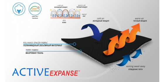 Боковая часть изготовлена из инновационной и приятной для кожи ткани ActiveExpanse - это очень легкая двухслойная объемная ткань со структурой 3D с хорошей циркуляцией воздуха и отводом пота от тела. Внешний слой из полиамидной объемной ткани 3D с повышенной механической прочностью и гипоаллергенными свойствами, внутренний слой из приятного для кожи хлопчатого трикотажа. Материал ActivExpanse отличается тем, что он неэластичный, таким образом улучшает стабилизацию. Изделия из этого материала очень комфортные.