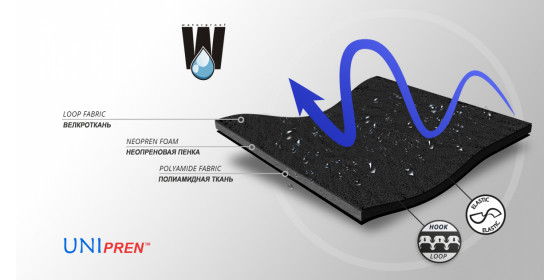 Боковые части изготовлены из UniPren™. Это универсальный трехслойный материал, состоящий из наружного эластичного полиамидного трикотажа с функцией самоприлипания, внутреннего слоя из неопреновой пенки и подкладки изнутри из эластичного трикотажа джерси. Функция самоприлипания материала определенно облегчает использование изделия. UniPren™ является водоотпорным материалом.