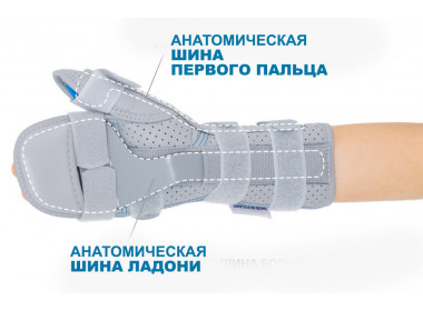 Ортез имеет ладонную шину анатомической формы, которая удерживает руку в нейтральном положении и предотвращает тыльное и ладонное сгибание, а также алюминиевый стабилизатор большого пальца, удерживающий палец в нейтральном положении. Дополнительная алюминиевая шина для первого пальца является отличительным элементом данного ортеза. Шина, отводящая большой палец руки, встроена в карман, находящийся сбоку изделия.