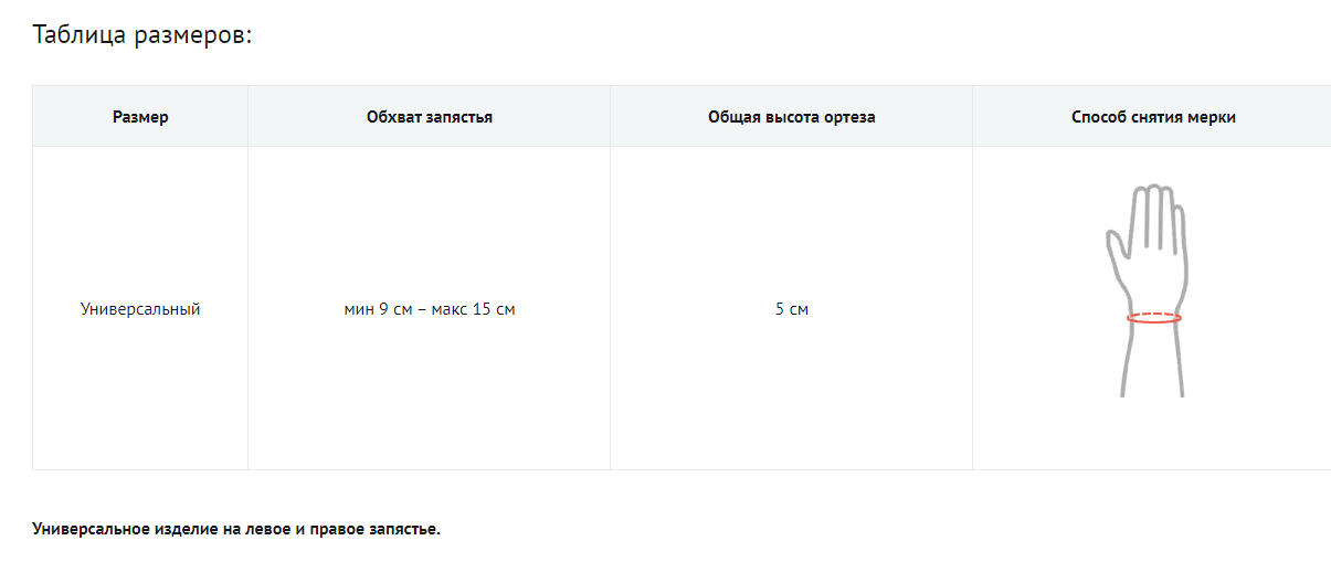 Ортез изготовлен в одном универсальном размере из тонкого цветного неопрена, его длина регулируется под запястье любого размера, также его можно носить на обе руки любой стороной. Подходит как для младенцев, так и для детей постарше. Обводной ремень ортеза изготовлен из ткани Velcro (липучки), что позволяет надежно фиксировать ортез на запястье. Изделие можно использовать для круглосуточной фиксации и стабилизации сустава.
