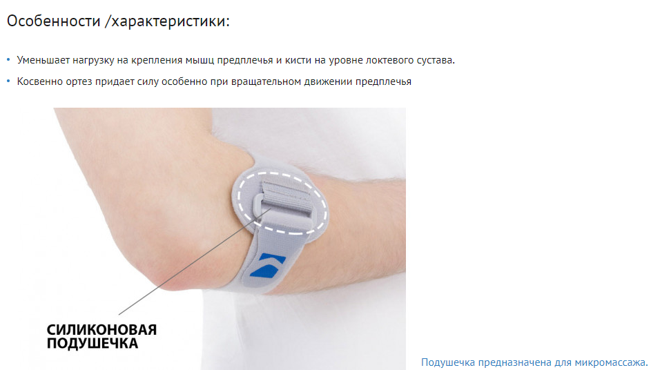 Инновационная конструкция ортеза AM-SL позволяет силиконовой подушечке концентрировать давление на мышцах и сухожилиях, затронутых этим заболеванием. Подушечка создает давление на места крепления проксимальных разгибателей и сгибателей предплечья и кисти. Уменьшает риск перегрузки и надрыва сухожилий, а в случае травмы облегчает и ускоряет заживание. Силиконовая подушечка предназначена для микромассажа во время ношения бандажа. Полиамидная пряжка регулирует силу давления.