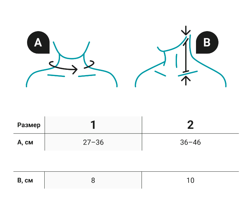 Для корректного подбора нужного размера ортеза ORLETT NB-106 со съемной шиной необходимо сантиметровой лентой плотно, но не утягивая, измерить окружность шеи и расстояние от угла нижней челюсти до середины ключицы. Затем, согласно таблице размеров подбирается подходящий размер.